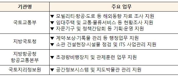 이번에 선발되는 청년인턴에게 단순 사무보조 업무는 지양하고, 전공과 관심 분야에 맞는 실무경험을 지원할 계획으로,모빌리티·항공 등 관련 분야 해외동향 및 사례 조사, 주택·교통 현황 조사 지원 등 정책수립 과정뿐만 아니라, 지능형교통체계(ITS)·공간정보 시스템 관리, 건설현장 점검, 관제훈련 지원 등 정책집행 과정에도 참여하는 등 다양한 분야의 실무경험을 습득하게 할 예정이다.