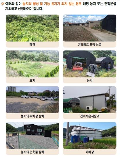공익직불금 신청 대상 농지라 하더라도 농지의 형상 및 기능이 유지되지 않는 폐경지, 주차장, 묘지, 창고, 농막 등 농작물을 재배하지 않는 농지는 제외하고 신청해야 한다. 만일 폐경지 등 농지를 제외하지 않고 직불금을 신청할 경우 직불금이 감액되거나 법적으로 제재될 수 있다. 따라서 신규로 신청 대상이 된 농지에 대하여는 직불금 신청 적정성 여부를 꼼꼼하게 살펴볼 필요가 있다.