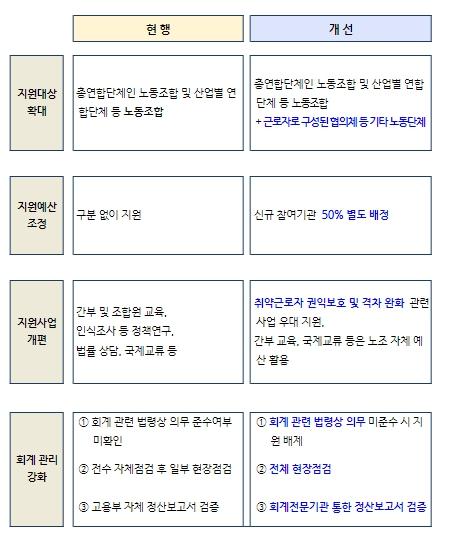 이번 사업 개편은 권익 보호의 사각지대에 있는 비정규직·미조직 등 취약 근로자에 대한 지원을 대폭 강화하고 국민의 세금으로 운영되는 국고지원사업이 더욱 투명하고 책임 있게 운영될 수 있도록 하기 위한 것으로 주요 내용은 다음과 같다.