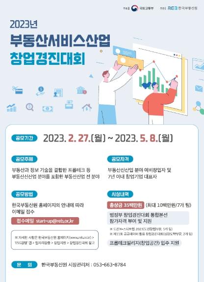 한편, 올해 열리는 부동산서비스산업 창업경진대회’의 보다 자세한 사항은 2월 27일부터 한국부동산원 누리집을 통해 확인할 수 있다.