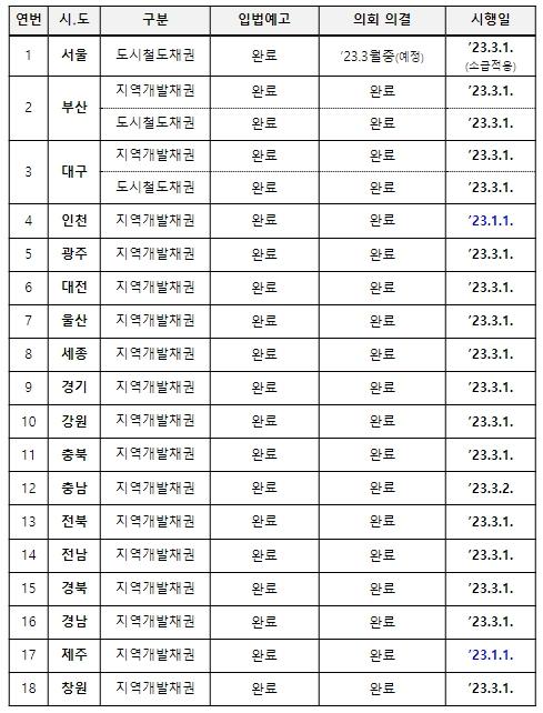 한편, 행정안전부와 시?도는 올해 1월부터 지역개발채권·도시철도채권의 표면금리를 1.05%(서울 1%)에서 2.5%로 인상했다.