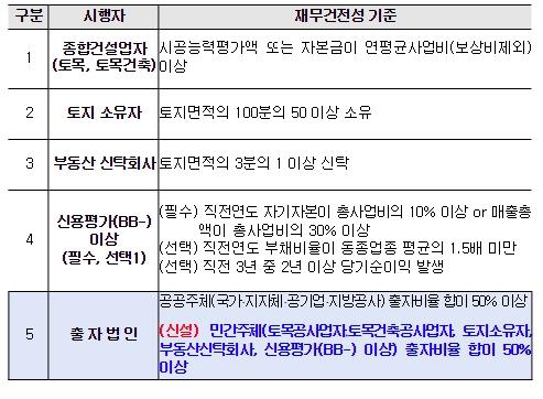 사업을 시행할 목적으로 설립된 법인의 범위를 당초 국가, 지방자치단체, 공기업, 준정부기관 및 지방공사 등 공공주체의 출자비율의 합이 100분의 50 이상인 경우로 한정하던 것을 앞으로는 재무건전성 조건을 갖춘 토목공사업자·토목건축공사업자, 토지소유자, 부동산 신탁회사 등을 포함한 민간주체 출자비율의 합이 100분의 50 이상인 경우까지 확대했다.