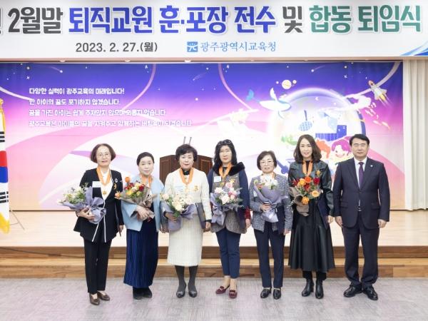 [중앙뉴스라인, 김병연기자] 광주시교육청이 지난 27일 오후 2시 시교육청 대회의실에서 유·초·중·고 퇴직교원과 동료교원, 가족 등이 참석한 가운데 ‘2023년 2월말 퇴직교원 훈·포장 전수 및 합동 퇴임식’을 개최했다.
