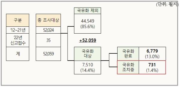 조달청은 귀속재산일 가능성이 있는 33,875필지에 대한 조사와 국유화를 맡아 23,443건에 대한 조사를 마치고, 53필지(8,016㎡, 공시지가 11억원)는 국유화를 완료하고 327필지도 국가의 품으로 되돌리기 위해 노력 중이다.