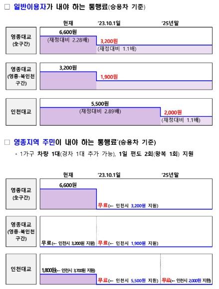 영종대교는 올해 10월 1일부터 재정 고속도로 대비 2.28배에서 1.1배로 통행료를 인하하고, 인천대교는 민간사업자에게 보전해야 할 금액이 크므로 경제여건 및 공공기관 재무여건을 고려하여 '25년 말부터 재정 고속도로 대비 2.89배에서 1.1배로 통행료를 인하한다.