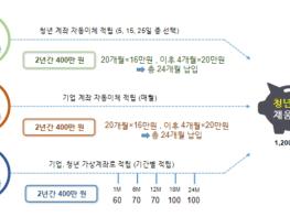 ② 적립구조 및 지급방식은 2년간 청년?기업?정부가 각각 400만원을 공동으로 적립하여 총 1,200만원을 만기 시에 청년에게 지급하게 된다.
