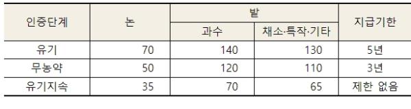 논의 경우 인증 단계에 따라 유기 70만원, 무농약 50만원을 지급한다.과수의 경우 유기 140만원, 무농약 120만원을 지급하며, 채소?특작 등 기타 밭 작물은 유기 130만원 무농약 110만원을 지급한다.