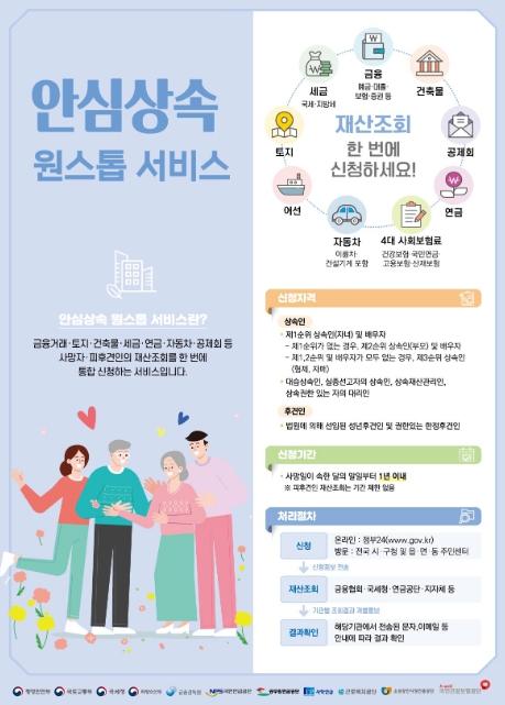 ?안심상속 원스톱서비스?는 상속인이 금융, 국세·지방세, 국민연금, 토지, 건축물 등 피상속인(사망자)의 상속재산을 한번에 조회할 수 있는 대국민 서비스이다.