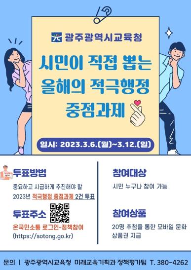 [중앙뉴스라인, 김병연기자] 광주시교육청이 오는 6일부터 12일까지 7일 동안 ‘온국민소통’에서 온라인 시민투표를 통해 ‘2023년 적극행정 중점과제’를 선정한다.