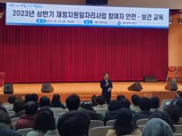 이번 교육에는 재정지원 일자리 사업 참여자를 비롯해 각 부서 안전관리 담당자 등 100여 명이 참석해 사업장별로 발생할 수 있는 위험요인을 사례로 들어 ‘중대재해처벌법’과 ‘안전 인식 및 주의사항’ 관련 내용으로 진행됐다.