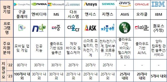 중소벤처기업부는 2019년 구글플레이와 모바일서비스 분야 창업기업의 성장을 지원하는 ‘창구 프로그램’을 시작으로 2022년에는 엔비디아?MS?다쏘시스템?앤시스?지멘스 등 6개 글로벌 기업으로 확대해 협업 프로그램을 운영했다.