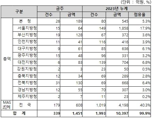 지역별 발주량을 보면, 총액계약 대상 843억 원 중 본청이 189억 원으로 22.4%를 집행하고 서울청 등 11개 지방청에서 654억 원을 각각 집행할 예정이다.