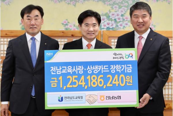 전라남도교육청 비즈니스실에서 열린 이날 전달식에는 김대중 전남미래교육재단 이사장을 비롯해 박종탁 농협중앙회 전남본부장, 정재헌 NH농협은행 전남본부장 등이 참석했다.