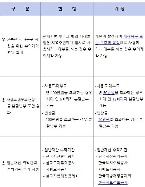먼저, 공유재산의 사용허가 · 대부는 공개경쟁계약이 원칙이나, 신속한 재해복구 지원을 위한 경우 수의계약 범위를 확대한다.