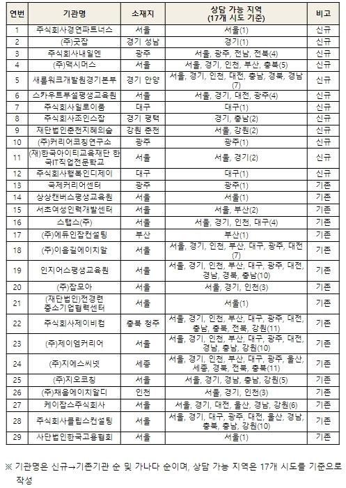 [중앙뉴스라인, 장성대기자] 고용노동부와 직업능력심사평가원(원장 최영섭)은 ?중장년 새출발 카운슬링?을 실시할 수 있는 운영기관을 추가로 선정하고 그 결과를 발표했다.