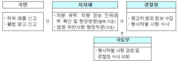 국토부와 지자체는 허위매물 의심?피해 사례가 접수되면 차량 유무, 차량 정보의 진위 여부 등을 확인하고, 신고 내용으로 법령 위반이 의심되면 해당 업체를 방문하여, 법령 위반 사항이 확인되면 영업정지 등 행정처분을 한다.