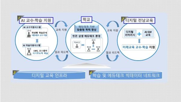첫째는 AI교수·학습지원 시스템(AI)으로, 학생별 학습 수준 분석, 에듀테크 추천 등 에듀테크 교수 지원 서비스 및 학습격차 해소를 위한 자기주도적 AI튜터 학생서비스를 지원한다는 게 골자이다.