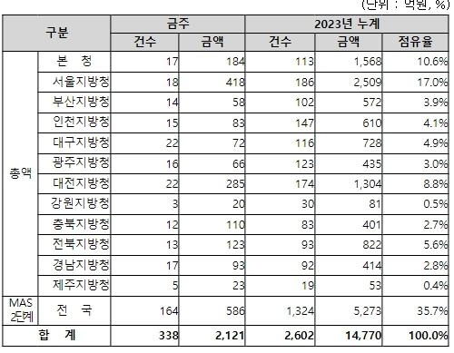 지역별 발주량을 보면, 총액계약 대상 1,535억 원 중 본청이 184억 원으로 12.0%를 집행하고 서울청 등 11개 지방청에서 1351억 원을 각각 집행할 예정이다.