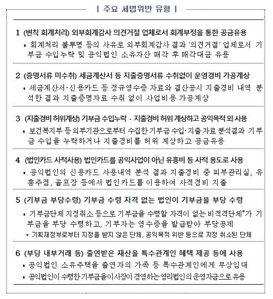 특히, 금년에는 다수의 국민으로부터 기부금을 출연받아 공익목적에 사용하지 않고 사적 용도로 사용하거나 회계 부정을 일삼는 등 사익편취 행위 근절을 위해 사후관리를 강화할 예정이다.