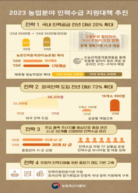 둘째, 올해 1월 농식품부와 고용부가 체결한 업무협약에 따른 도시 구직자 모집 활성화로 농번기 인력 부족 농가에 인력이 원활히 공급될 수 있도록 지원한다.