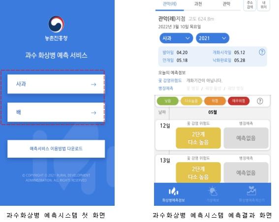 농촌진흥청은 지난해 선문대학교, 에피넷(주)과 함께 개화기에 강우 및 온·습도 등을 고려해 과수화상병 방제 적기를 알려주는 케이(K)-메리블라이트 예측 모형을 개발했다. 이를 바탕으로 과수화상병 예측정보시스템을 구축해 농가에 방제 적기 정보를 제공했다.