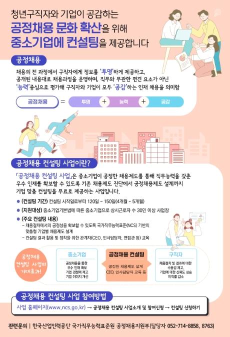 [중앙뉴스라인, 장성대기자] 고용노동부와 한국산업인력공단(이사장 어수봉)은 3.21일 ?공정채용 컨설팅? 사업을 신규 시행하고, 채용 제도에 대한 정보?체계가 부족한 중소기업 150개소를 직접 찾아가 공정채용 제도의 설계?도입을 무료로 지원한다. 참여를 희망하는 중소기업은 사업 홈페이지에 접속해 원하는 컨설팅 기관을 선택하고 신청하면 된다.