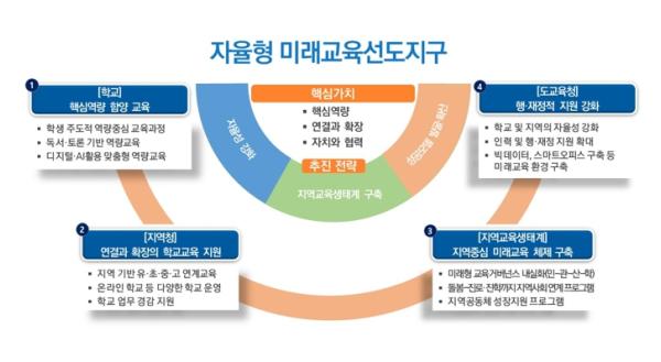 또, 연구학교 지정권, 과장(센터장) 인사 추천권, 자율감사제, 자율적 조직 구성·운영 등을 위임하고, 민·관·산·학 교육거버넌스를 구축해 돌봄부터 진로·진학까지 지역교육 현안 전반에 대해 자율성을 부여한다.