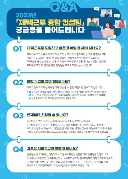 올해는 3월 23일(목)~4월 12일(수)까지 3주간 1차 신청을 받고, 앞으로 총 4차에 걸쳐 컨설팅 희망 기업을 모집한다. 컨설팅 내용은 재택근무 관련 ①도입범위, 운영방식, 적합직무 분석, ②인사?노무관리체계 구축, ③재택근무에 필요한 정보기술 기반 구축, ④기타 재택근무 지원사업(간접노무비, 인프라 구축비) 및 중기부 ‘비대면 서비스 바우처 지원사업’과의 연계 지원 등이다.