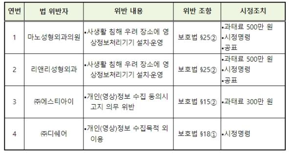 마노성형외과의원과 리앤리성형외과는 병원 내 별도 탈의실이 마련되어 있음에도 범죄 예방, 의료사고 방지 등의 목적으로 영상정보처리기기를 설치?운영한 회복실에서 환자들이 환복(탈의)하도록 안내했고 실제 환자들이 탈의했다.