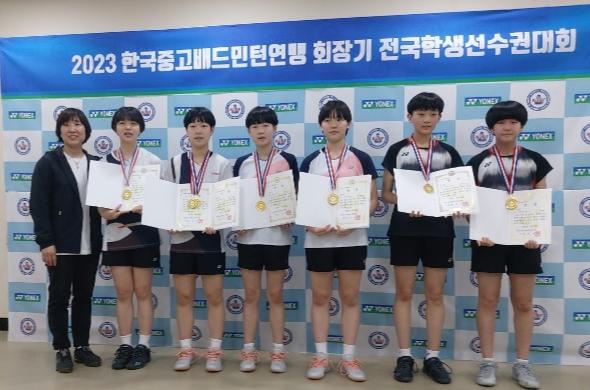 3학년 김나연 선수는 여중부 3학년 단식 결승에서 마산 성지여중 이송현 선수를 2대0으로 제압하고 정상에 올랐다. 김나연 선수는 여중부 3학년 복식경기에서도 권혜원 선수와 조를 이뤄 성지여중과의 결승에서 압도적인 경기력으로 2대0(21:3, 21:12)으로 승리해 2관왕에 올랐다.