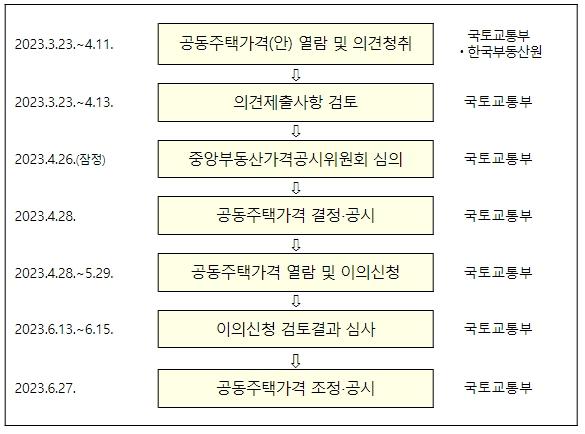 '23년 공동주택 공시가격(안)은 4.11일까지 소유자 등의 의견을 제출받아 반영 여부를 검토하고, ?부동산 공시법?에 따른 중앙부동산가격공시위원회의 심의를 거쳐, 4.28일 결정·공시할 예정이다.