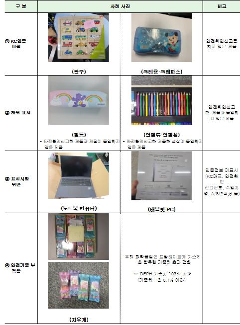 적발된 제품으로는 △지우개, 연필, 필통 등 학용품이 약 20만 개로 가장 많았으며, △완구류 약 3만 4천 개, △태블릿PC 약 1천 개가 그 뒤를 이었다.