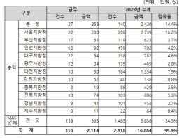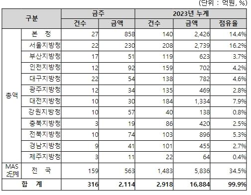 지역별 발주량을 보면, 총액계약 대상 1,551억 원 중 본청이 858억 원으로 55.3%를 집행하고 서울청 등 11개 지방청에서 693억 원을 각각 집행할 예정이다.