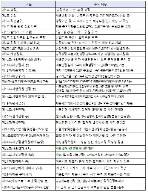 그러나 행정기관 공무원과 공직유관단체(공사·공단 등)의 임직원 채용은 채용단계별 상세한 공정채용 절차를 규정하는 법령과 지침이 있는 반면, 행정기관 비공무원 채용은 모든 행정기관이 적용할 공통적이며 체계적인 기준이 없어 관리·감독 또한 이루어지지 않은 채 관리 사각지대로 남아 채용비리 사건이 지속적으로 발생하고 있다.