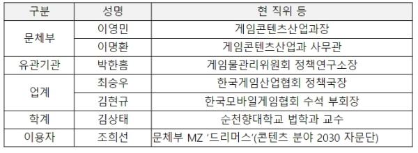 아울러 문체부의 MZ ‘드리머스(Dreamers, 2030 자문단)’의 일원인 강원대학교 영상문화학과 조희선 씨가 함께한다. ‘드리머스’는 문화 분야 현장의 목소리와 청년의 시각을 정부에 전달할 수 있도록 지난 12월에 문화·콘텐츠·체육·관광 각 분야에서 선발된 자문단이다. 조 씨는 확률형 아이템, 핵(Hack) 프로그램 사용 등을 주제로 논문을 저술한 이력을 살려 TF에서 의견을 개진할 것으로 기대된다.
