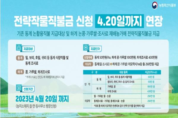 농림축산식품부, 2023년도 전략작물직불금 등록기간 4월 20일까지 연장