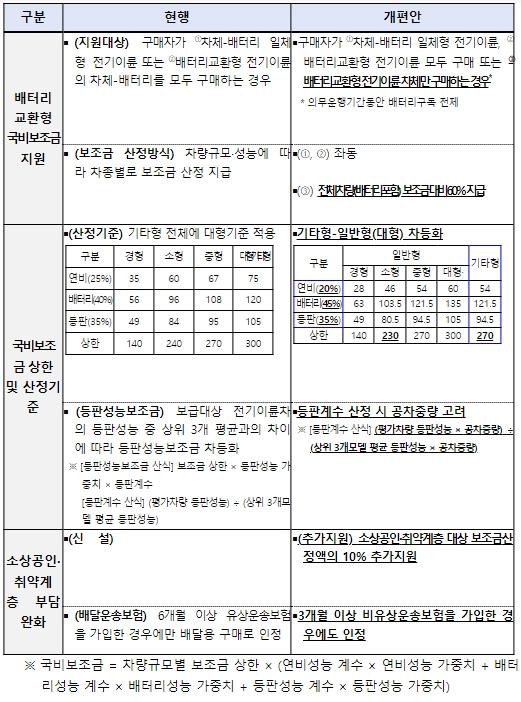 그간 기타형 전기이륜차(3륜 차량 등)에 대해서는 성능·규모와 상관 없이 일반형(대형) 전기이륜차 보조금 상한이 적용되어 일반형에 비해 과도한 보조금이 지급된다는 지적이 제기되어 왔다.