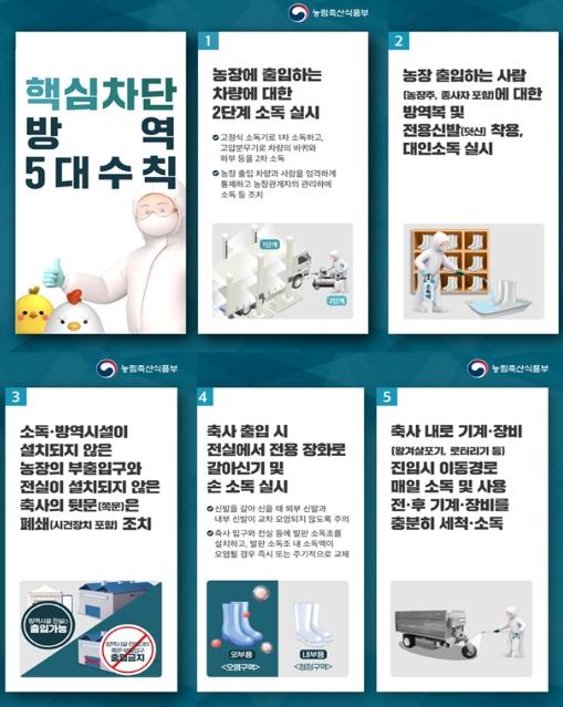 농식품부는 조류인플루엔자 H5형 항원이 확인된 즉시 초동대응팀을 현장에 투입하여 해당 농장에 대한 출입통제, 살처분, 역학조사 등 선제적인 방역조치를 실시하고 있으며, 조류인플루엔자 예방 및 확산 방지를 위해 발생 지자체에서 일시이동중지(Standstill) 명령을 발령한다고 밝혔다.