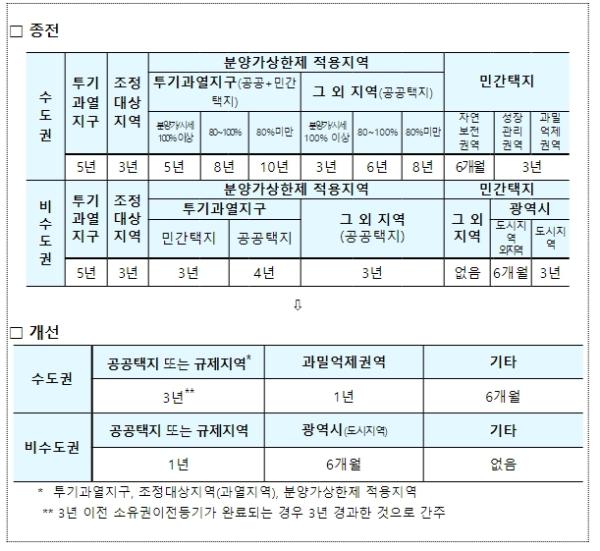 수도권은 공공택지?규제지역은 3년, 과밀억제권역은 1년, 그 외 지역은 6개월로 완화하고, 비수도권은 공공택지?규제지역은 1년, 광역시 도시지역은 6개월로 완화하고, 그 외 지역은 전면 폐지한다.