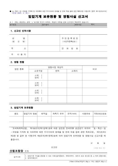 산림청은 이번 서식 개정을 통해 ?행정절차 간소화로 민원 편의 증대 및 조합 등 관련기관의 민원을 해소했으며, ?임업 기계장비 신고를 위한 증빙서류의 범위를 법령의 범위 안에서 확대하여 적극행정 실현이 기대된다고 밝혔다.