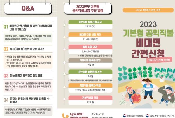 농림축산식품부는 읍면동 주민센터에 방문해야 신청할 수 있었던 ‘기본형 공익직불금을 카카오톡이나 문자메시지는 물론, 전화자동응답시스템(ARS) 등으로도 신청할 수 있도록 개선했다.