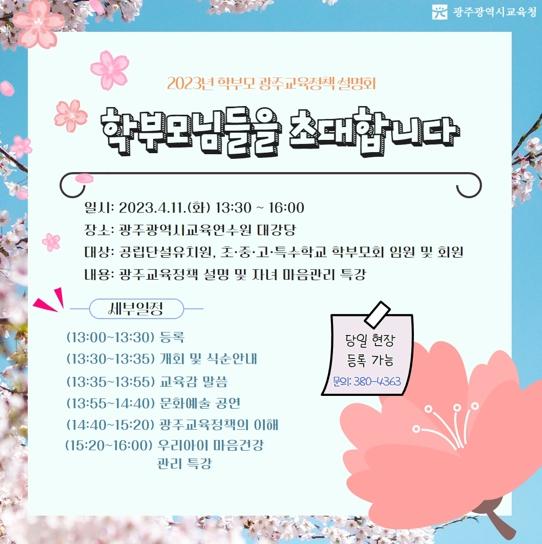 5일 시교육청에 따르면 이번 설명회는 각급 학교 학부모회 임원뿐 아니라 광주교육에 관심 있는 학부모라면 누구나 참석할 수 있다. 이는 코로나 팬데믹 이후 3년 만에 갖는 대면 설명회로 학부모들의 관심이 매우 뜨거웠다. 사전 신청 결과 총 600여 명의 학부모가 참석을 희망했다. 11일 당일 현장 등록을 통해 참석도 가능하다.