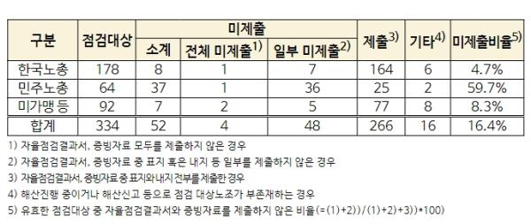 상급단체별로 보면, 한국노총의 미제출 비율은 4.7%(8개), 미가맹 등은 8.3%(7개)인데 반해 민주노총 소속 노동조합의 미제출 비율이 59.7%(37개)에 달해 한국노총에 비해 12배 이상 높은 것으로 나타났다. 이는, 한국노총의 경우 총연맹의 자료제출 거부 지침에도 불구하고 95.3%(164개)의 노동조합이 자료를 제출한 데 따른 것으로 보인다.
