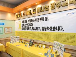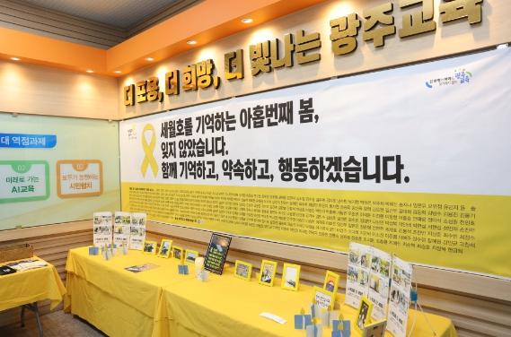 광주교육청 본관 1층에 추모 공간을 마련하고, 그날을 기억하고 있다. 추모공간에는 ‘세월호를 기억하는 아홉 번째 봄, 잊지 않았습니다. 함께 기억하고, 약속하고, 행동하겠습니다’라고 새긴 약속과 기억의 플래카드를 내걸었다.