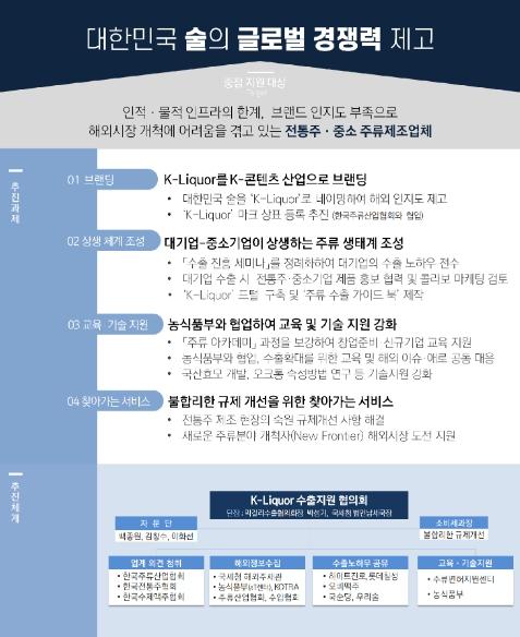 ?K-Liquor 수출지원협의회?는 앞으로 ①대한민국 술 브랜딩, ②상생의 주류 생태계 구축, ③주류제조 교육?기술 지원 강화, ④찾아가는 서비스를 중점적으로 추진한다.