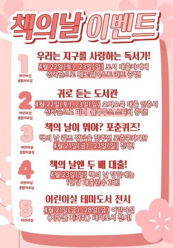 ‘세계 책의 날’인 23일에는 1인당 대출 권수를 두 배로 늘려주는 행사를 통해 시민들에게 책의 날을 홍보하고 도서관을 찾는 즐거움을 전하고자 한다.