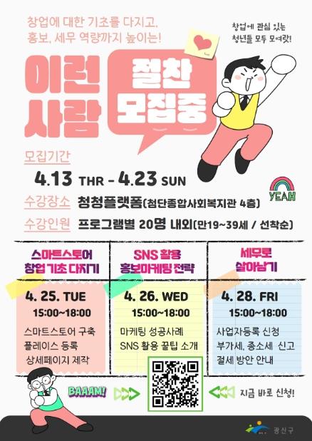 광산구에 거주하고 있거나 광산구에서 활동하는 만 19~39세 예비창업가와 3년 이내 초기창업가를 대상으로, 23일까지 최대 60명을 선착순으로 모집한다.