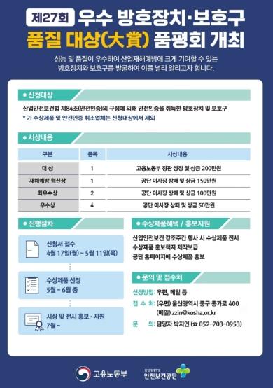 [중앙뉴스라인, 장성대기자] 안전보건공단은 산업현장의 우수 안전제품을 선정하여 시상하는'방호장치?보호구 품질 대상(大賞) 품평회'를 개최한다. 올해 27번째를 맞는 품평회는 산업현장에 안전한 제품의 유통과 사용을 유도함으로써 산업재해 감소에 기여하기 위해 실시하고 있다.