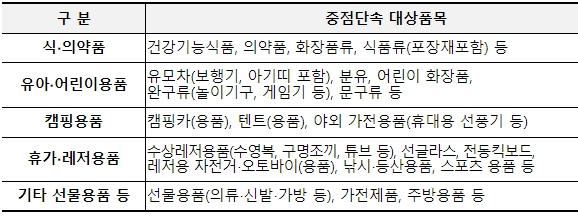 5대 중점단속 품목은 ▲식?의약품, ▲유아?어린이용품, ▲캠핑용품, ▲휴가?레저용품, ▲기타 선물용품 등이다.