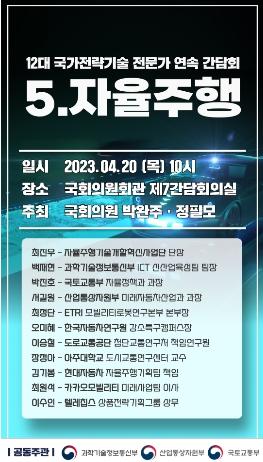 [중앙뉴스라인, 우제헌기자] 국회 과학기술정보통신위원회 소속 박완주 의원과 정필모 의원이 공동주최하고, 정부 부처(과학기술정보통신부?국토교통부?산업통상자원부)가 공동주관하는 『12대 국가전략기술 첨단모빌리티- 자율주행 전문가 연속 간담회』가 20일 개최된다.